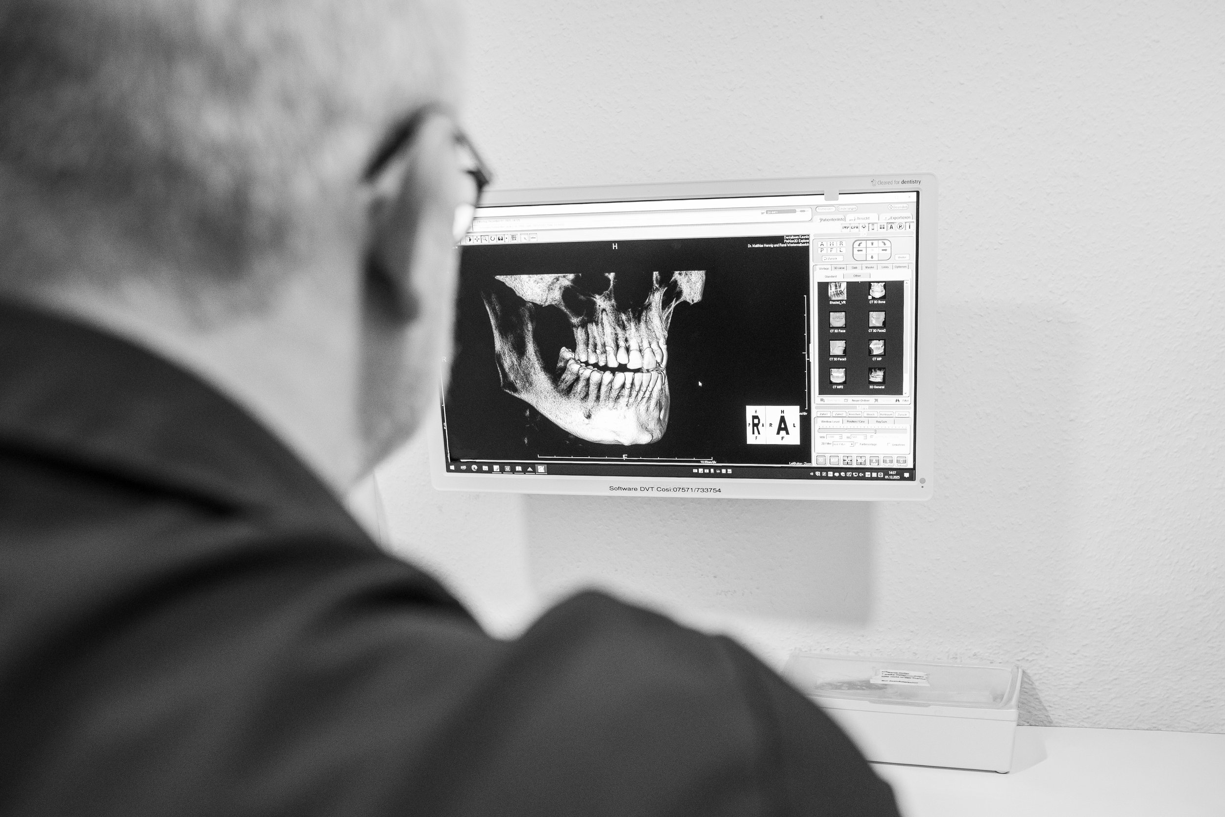 Die digitale 3D-Röntgendiagnostik, auch Digitale Volumentomographie (DVT) genannt, ist ein modernes bildgebendes Verfahren, das in der Zahnmedizin und Kieferchirurgie eine besonders präzise Darstellung von Zähnen, Kieferknochen, Nervenverläufen und Weichgewebsstrukturen ermöglicht.